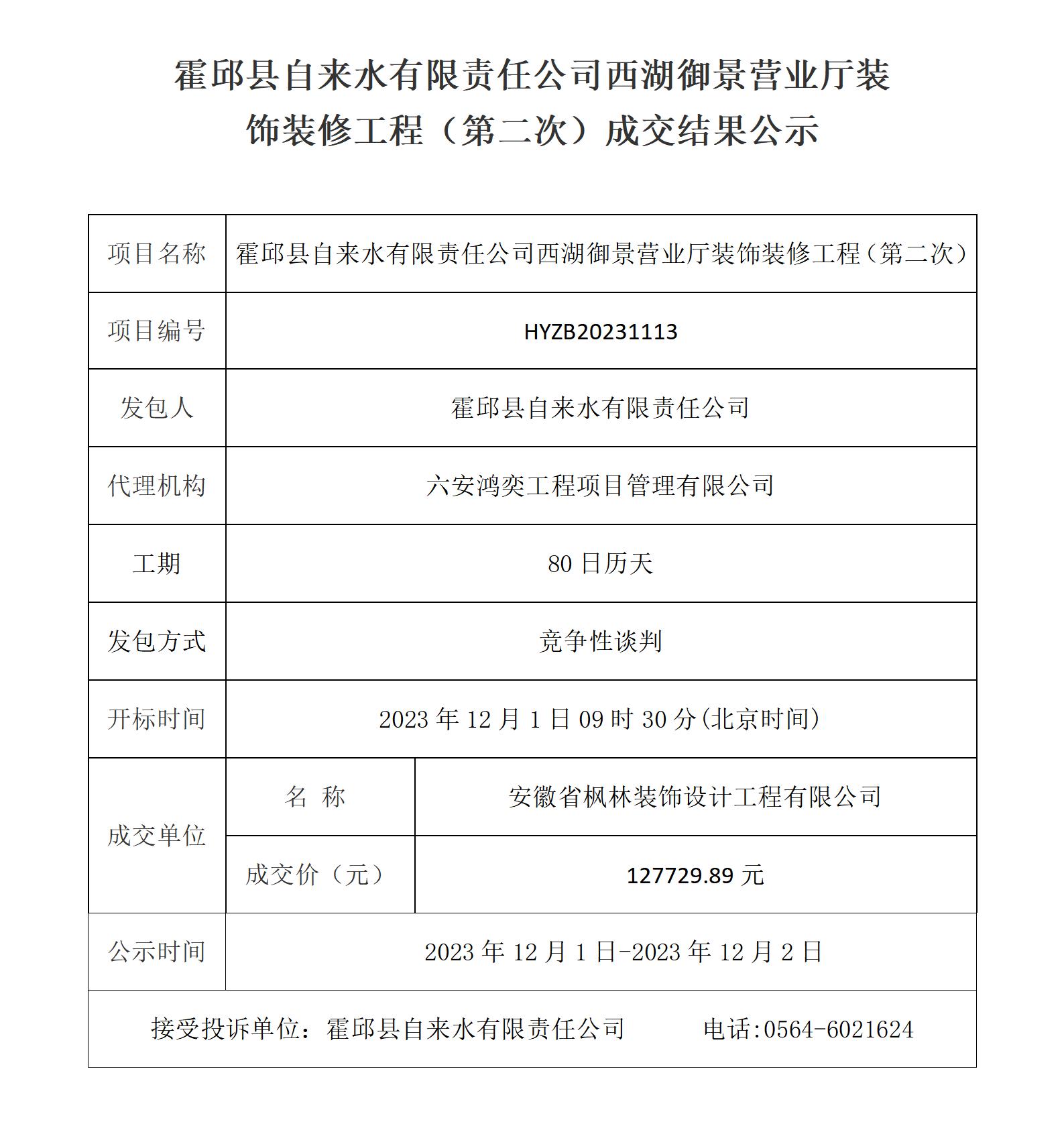 霍邱县自来水有限责任公司西湖御景营业厅装饰装修工程(第二次)成交结果公示