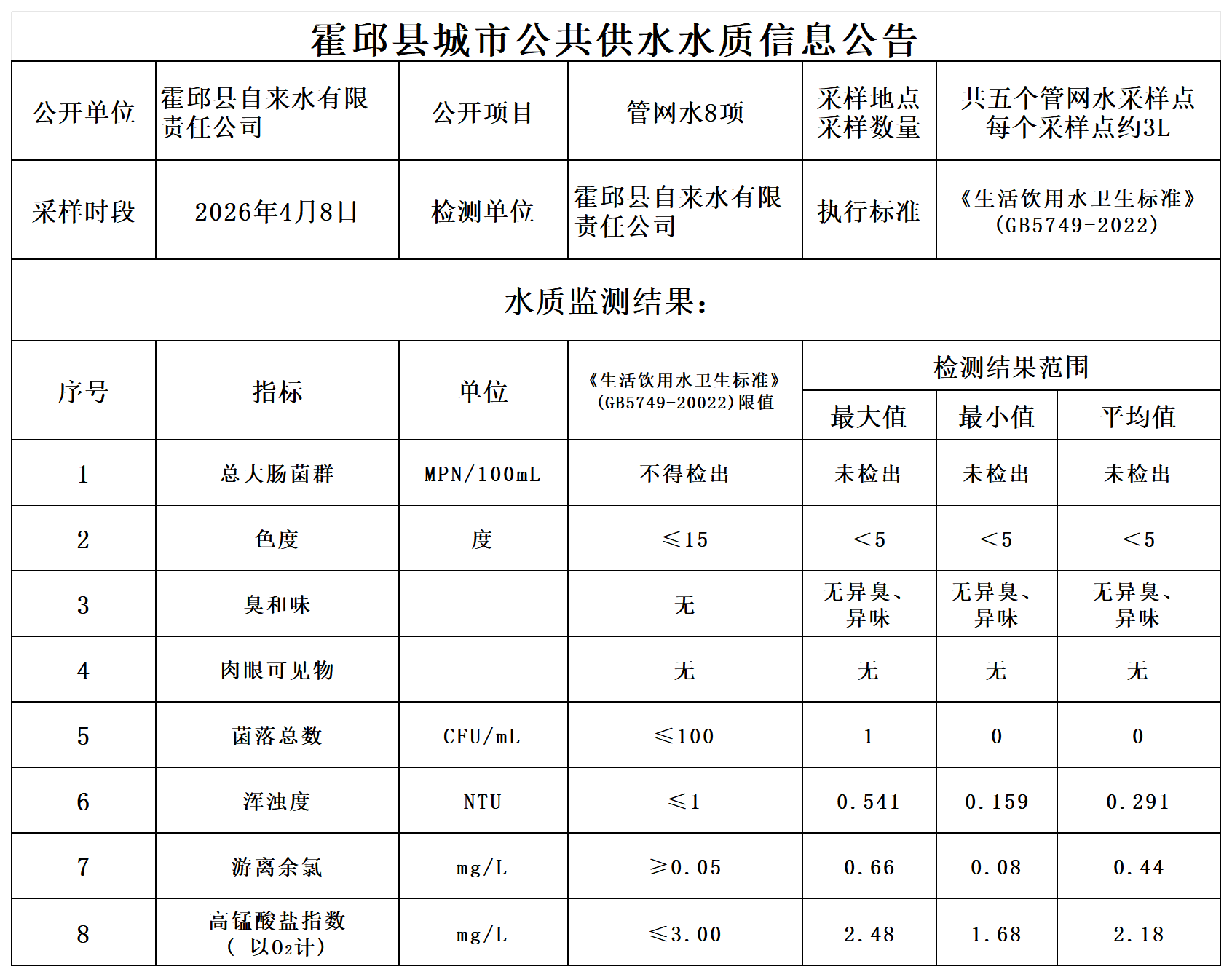 您现在的位置: 首页 - 通知公告 - 水质公告 - 管网水水质(8项) - 2026年4月上半月管网水...