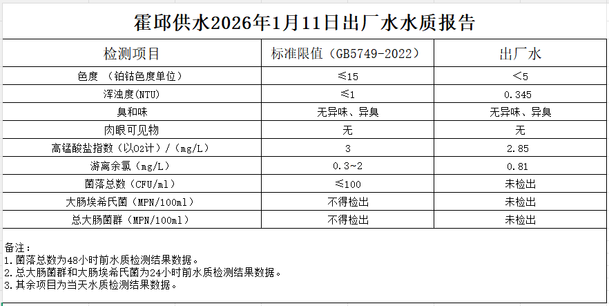 2026年1月11日出厂水水质报告