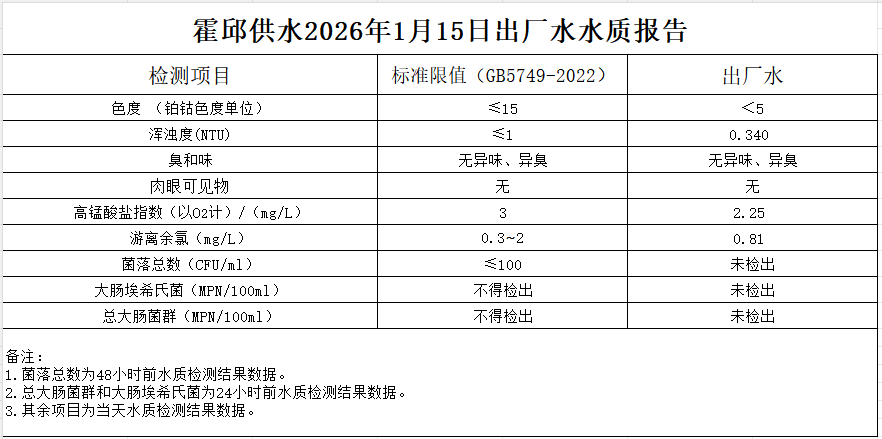 2026年1月15日出厂水水质报告