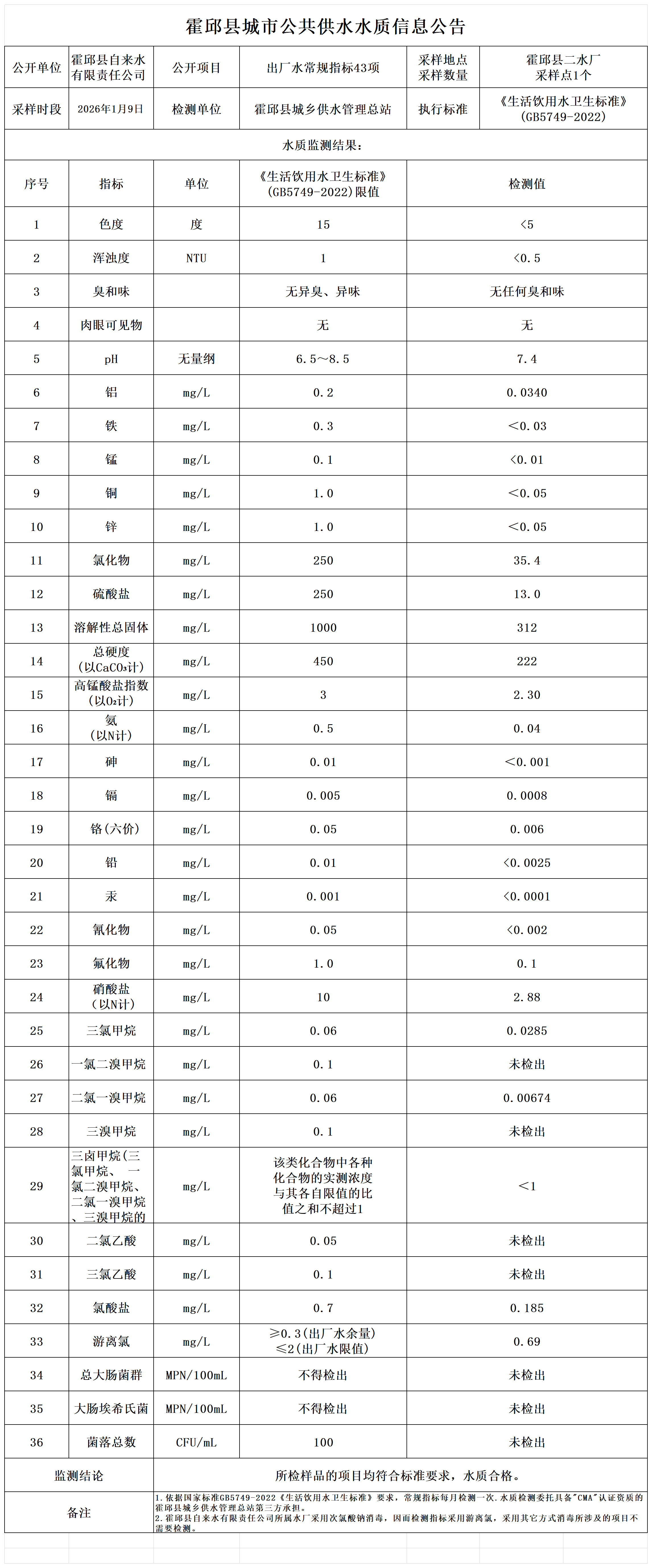 您现在的位置: 首页 - 通知公告 - 水质公告 - 出厂水水质(43项) - 2026年1月出厂水水质(...