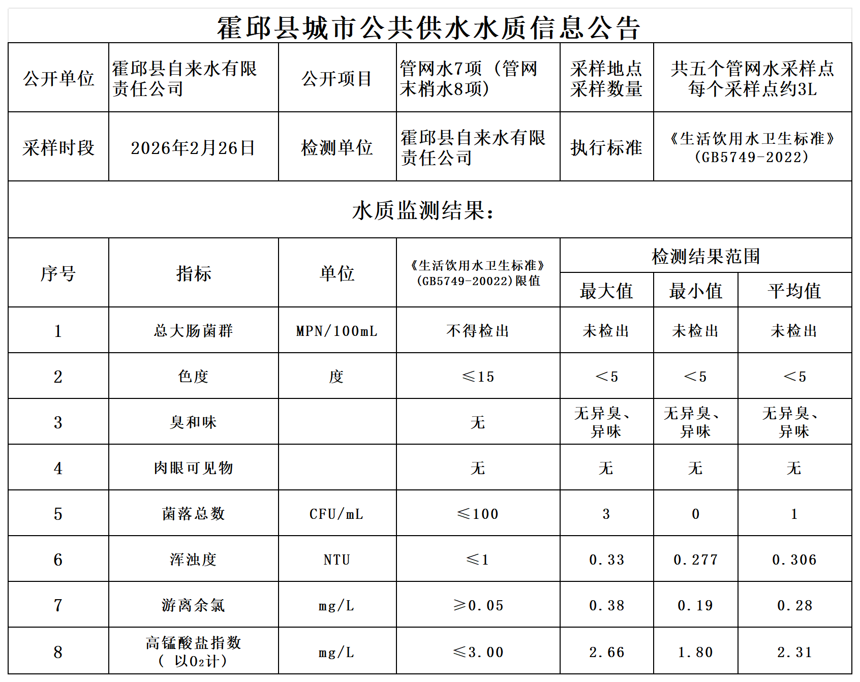 2026年2月下半月管网水水质